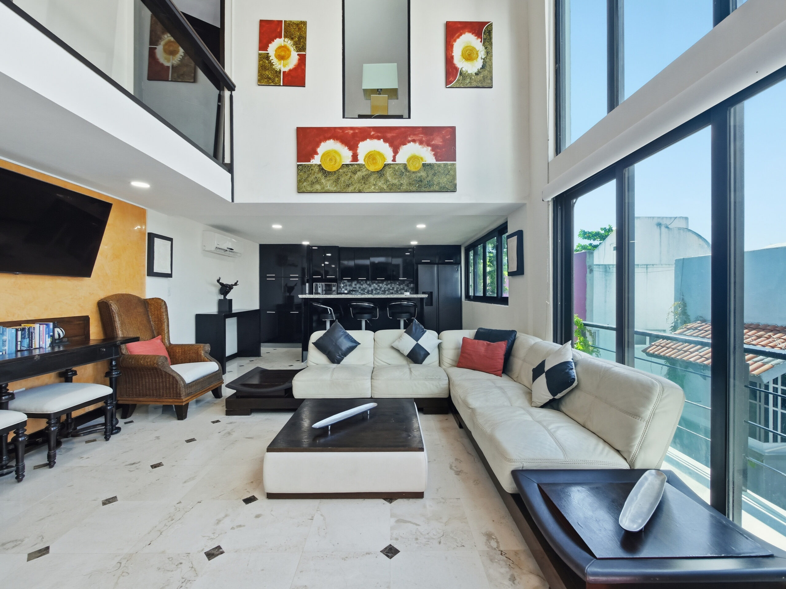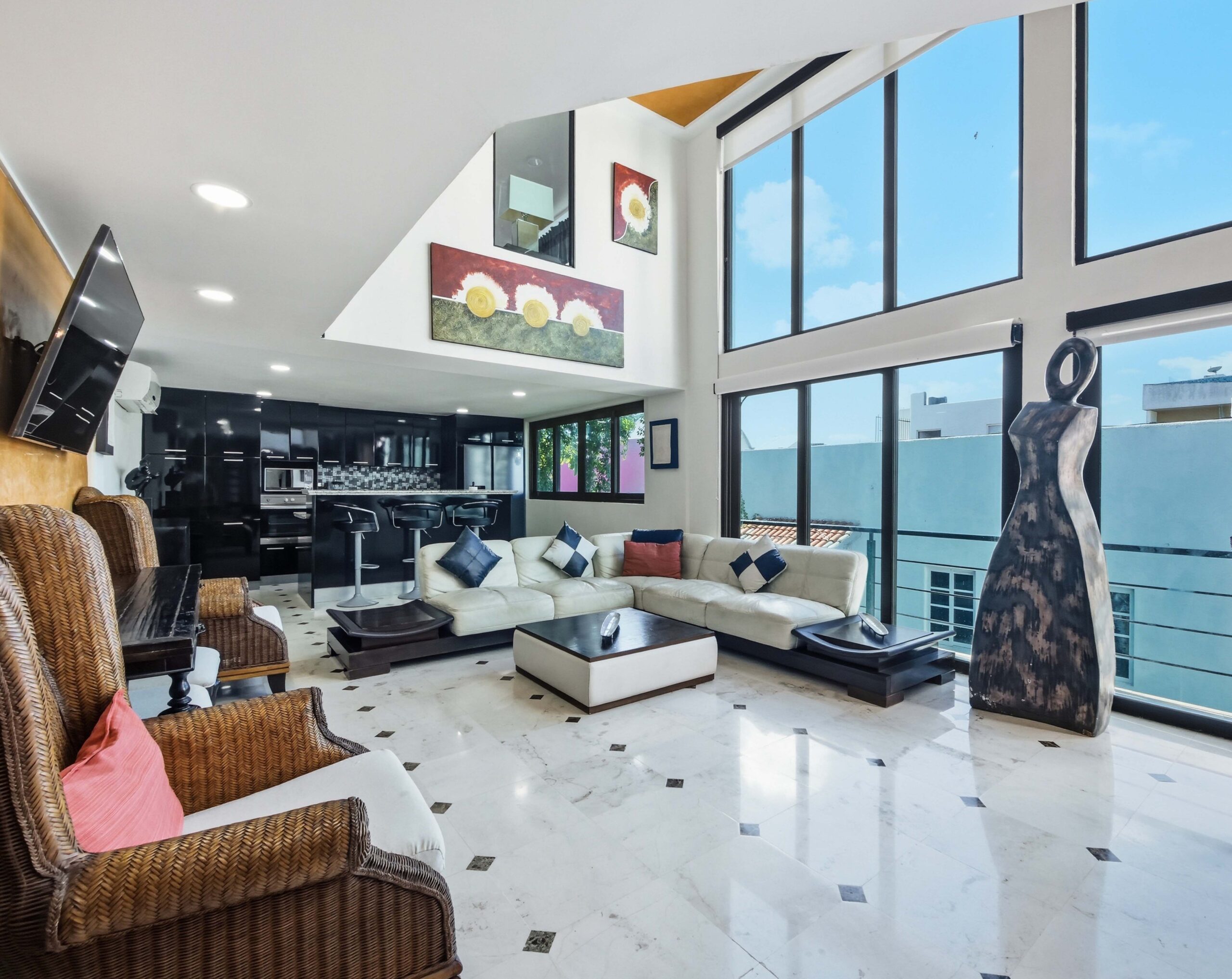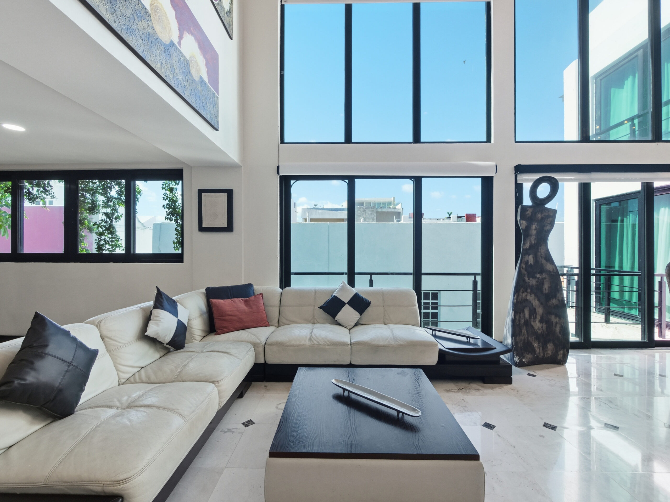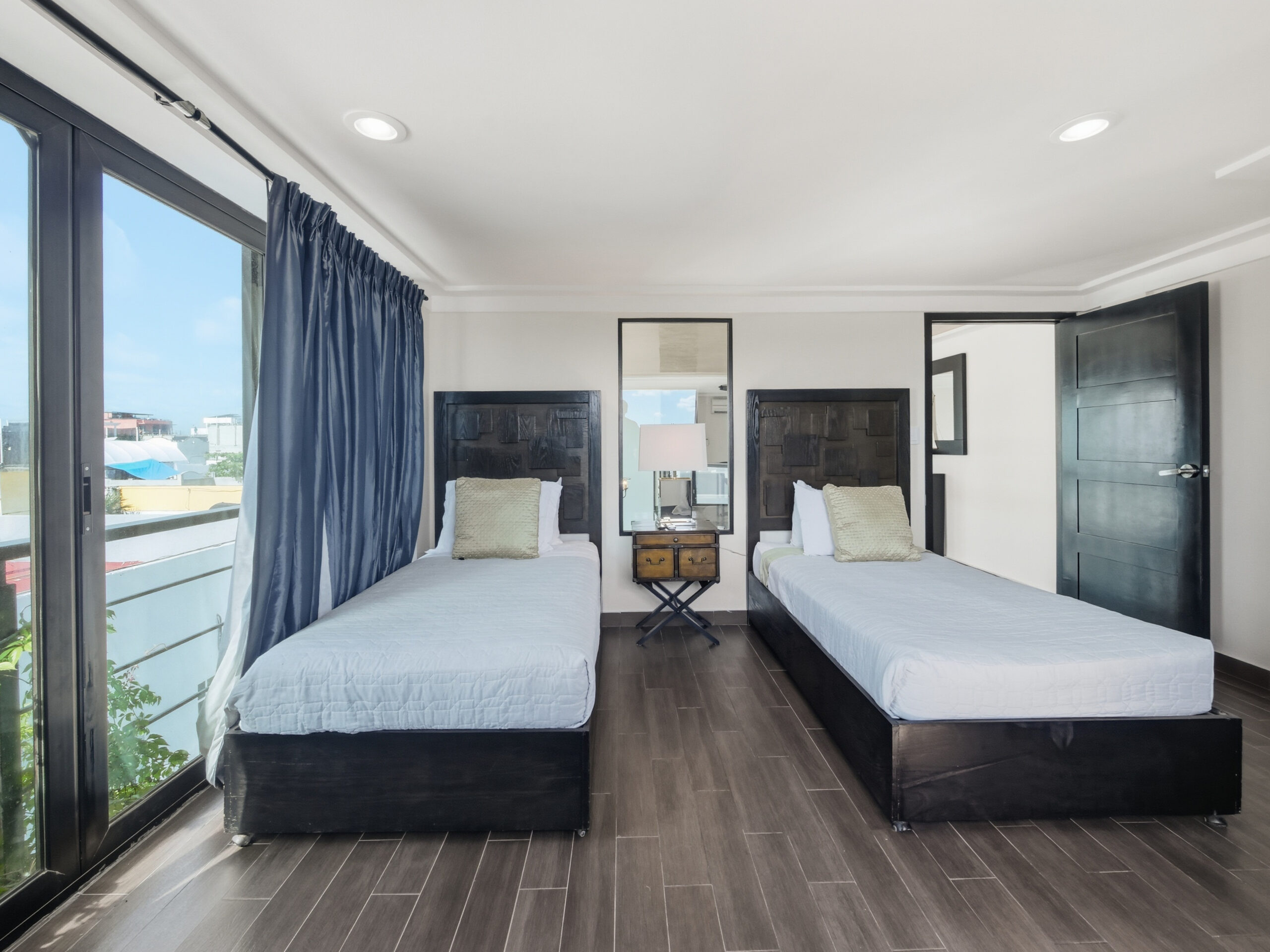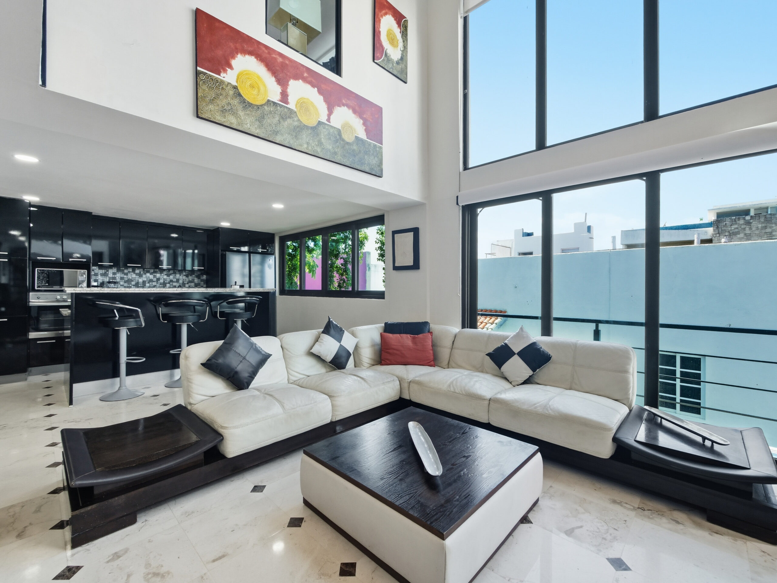This two-tier penthouse has three bedrooms ideal for groups or families: a main one with a king bed, a secondary with a king bed and another with two single beds. The bathrooms are located in the hallways. Spacious and functional spaces designed to provide privacy, comfort and rest in the heart of Playa del Carmen.