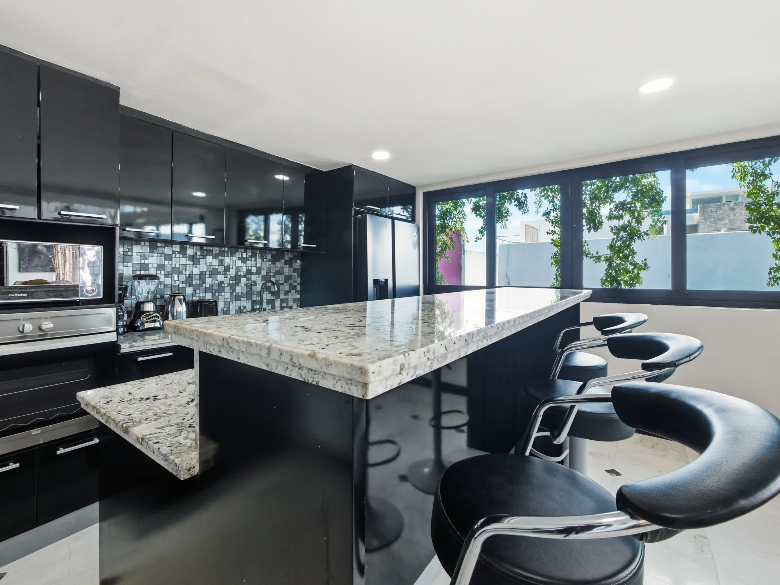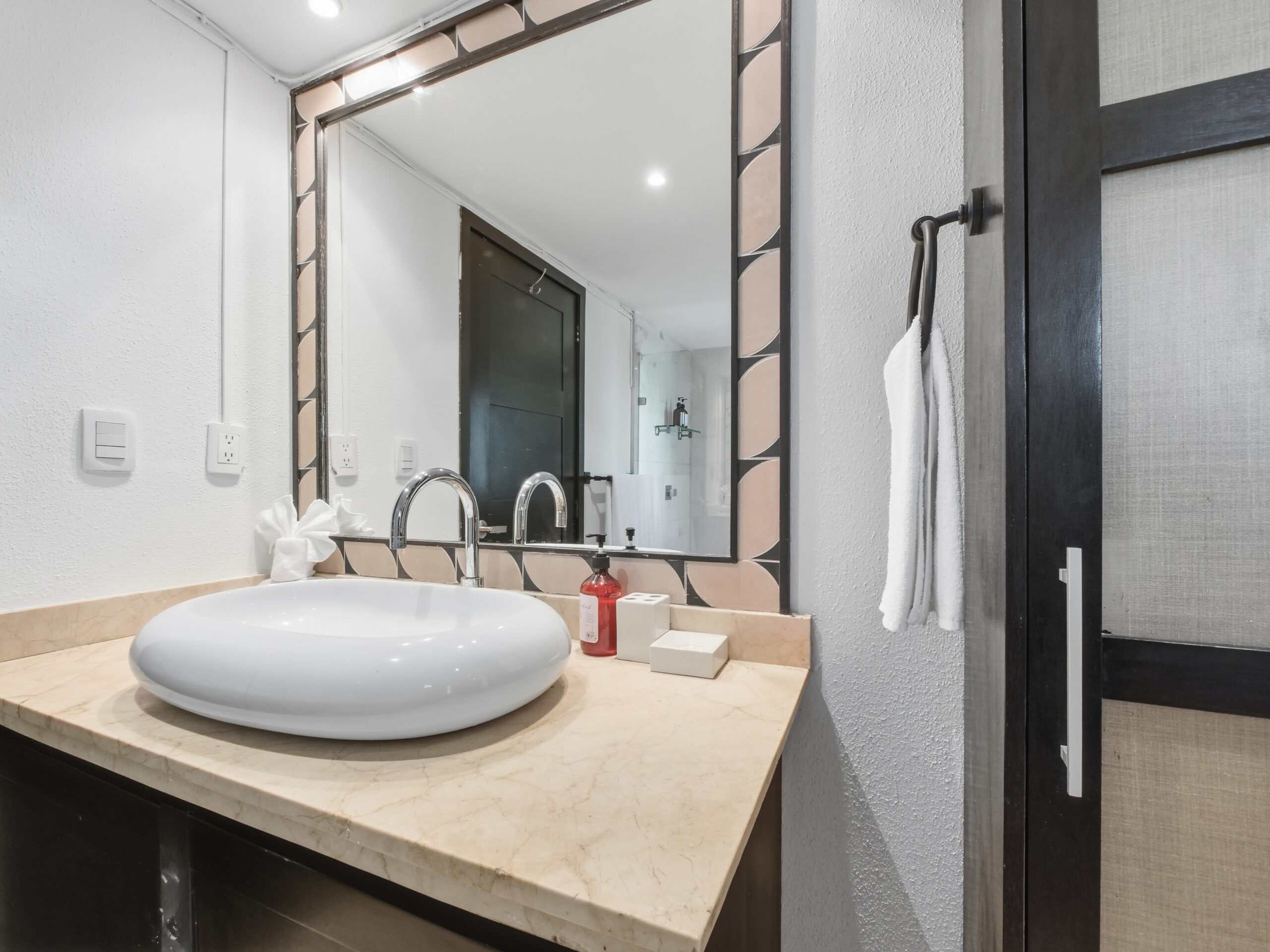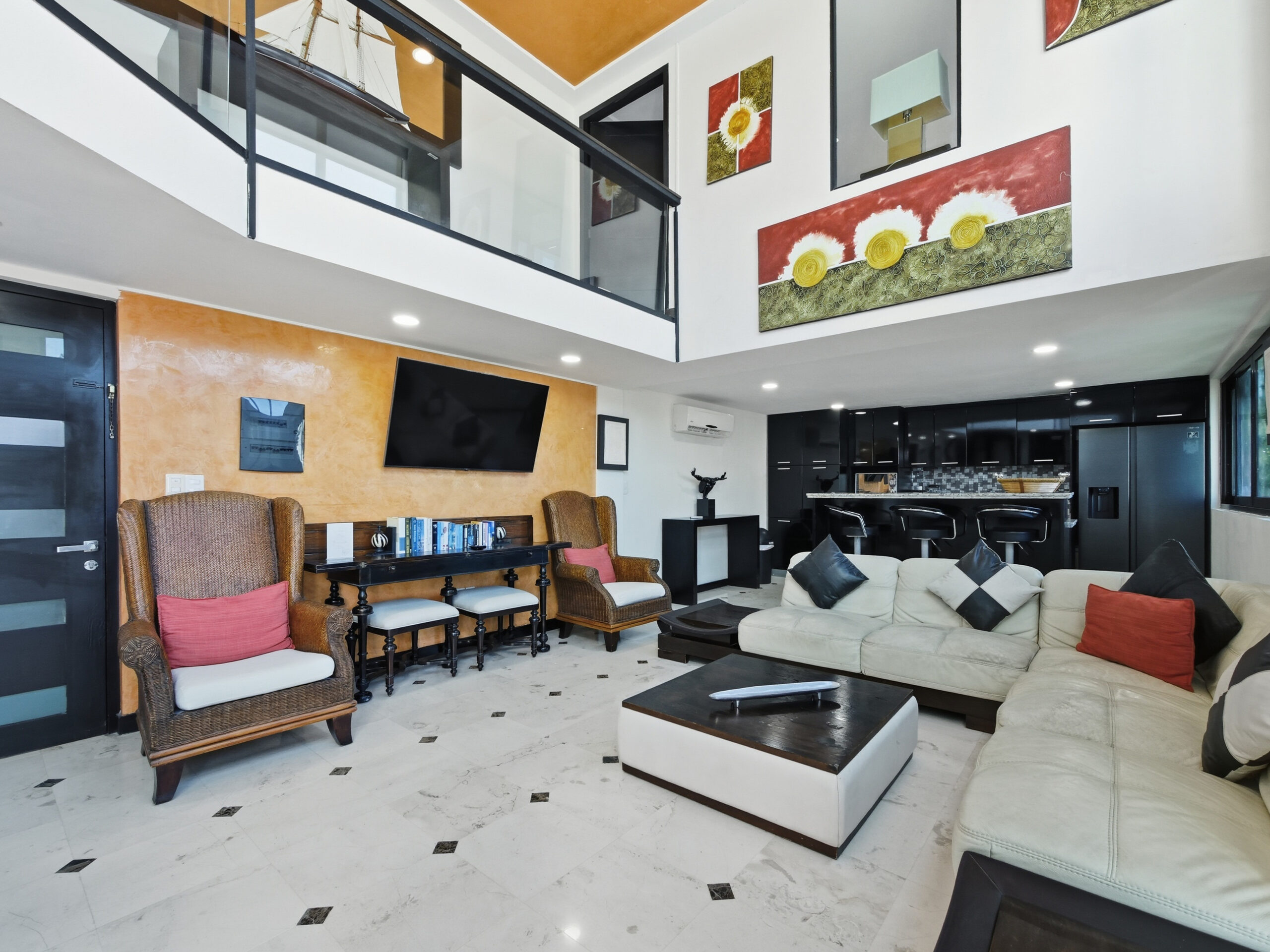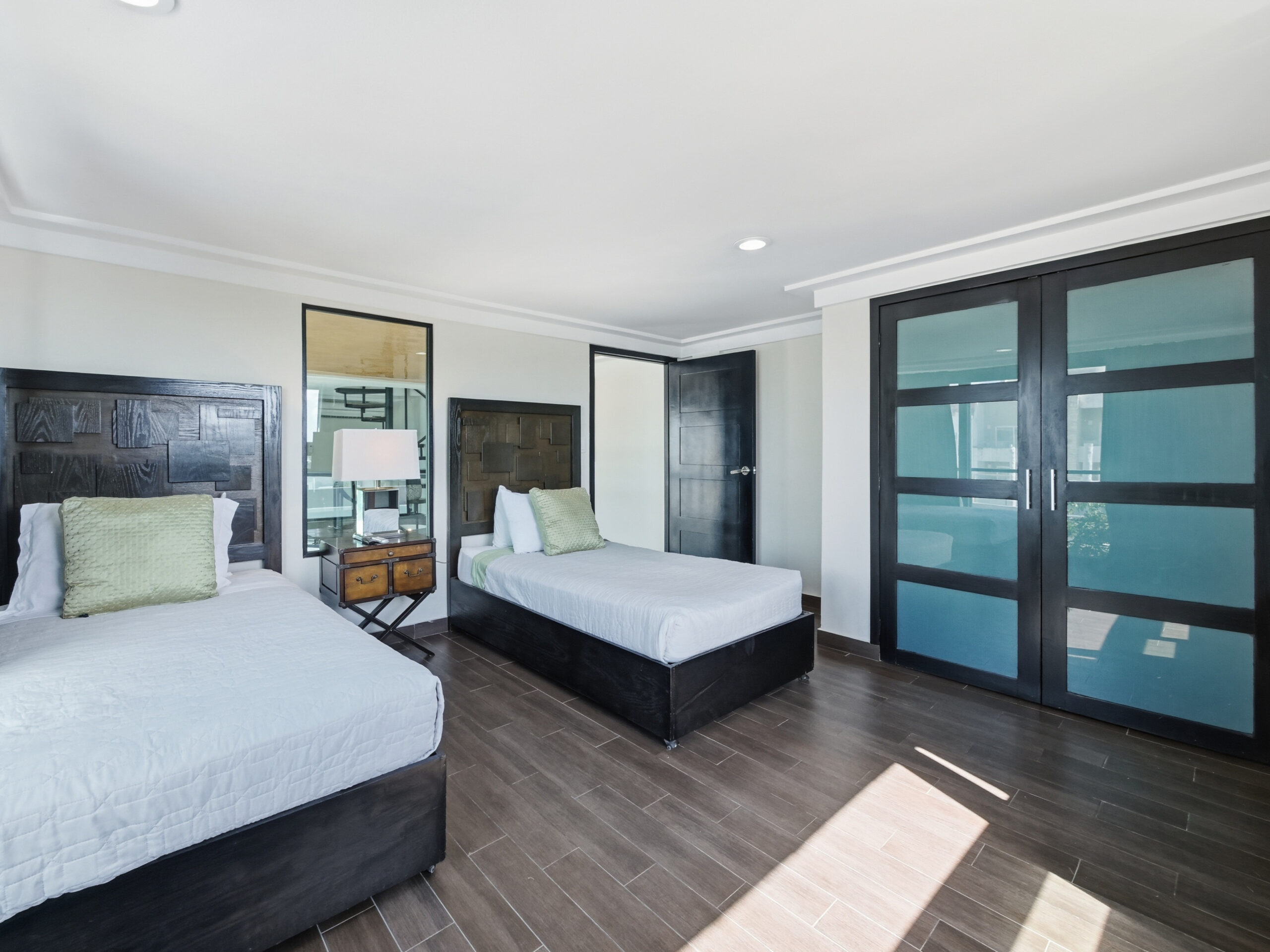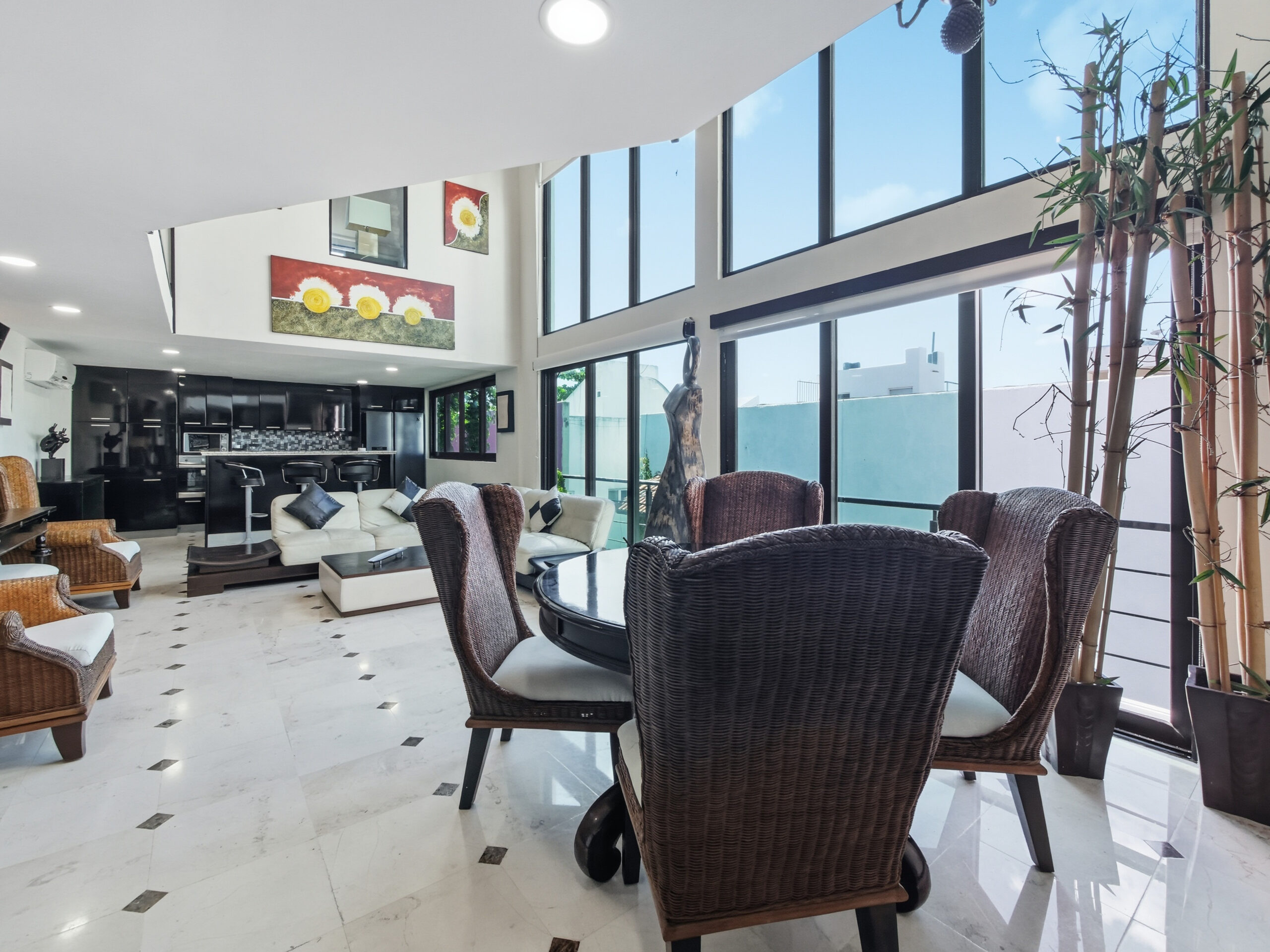 This two-tier penthouse has three bedrooms ideal for groups or families: a main one with a king bed, a secondary with a king bed and another with two single beds. The bathrooms are located in the hallways. Spacious and functional spaces designed to provide privacy, comfort and rest in the heart of Playa del Carmen.