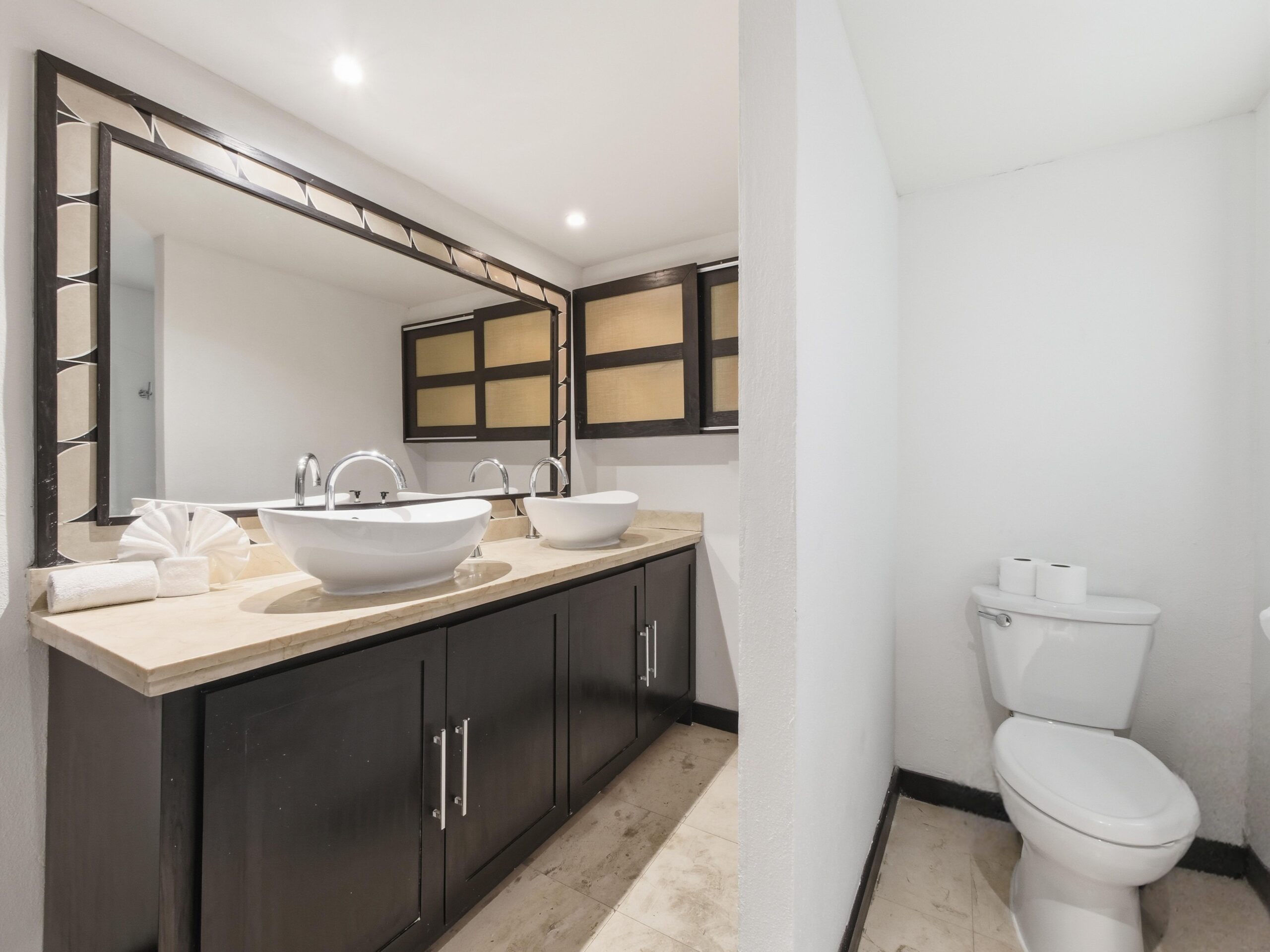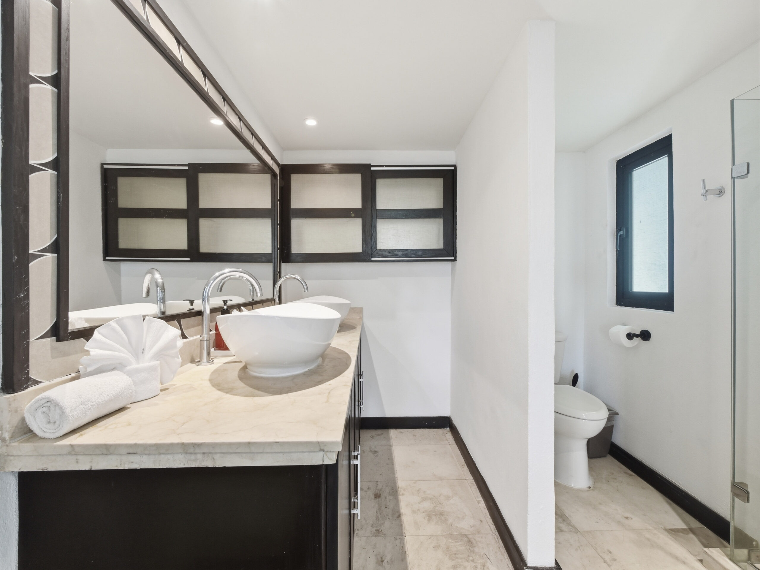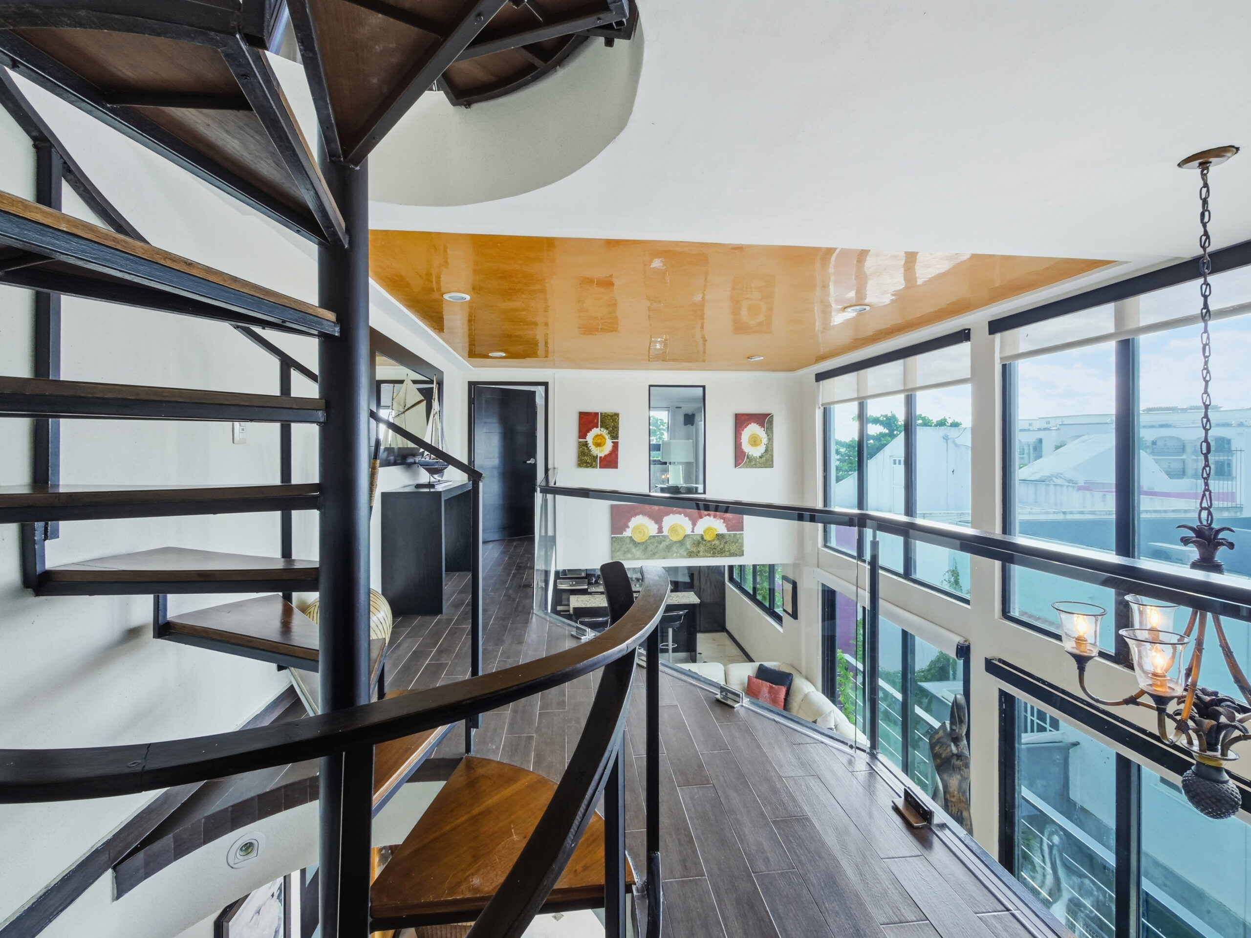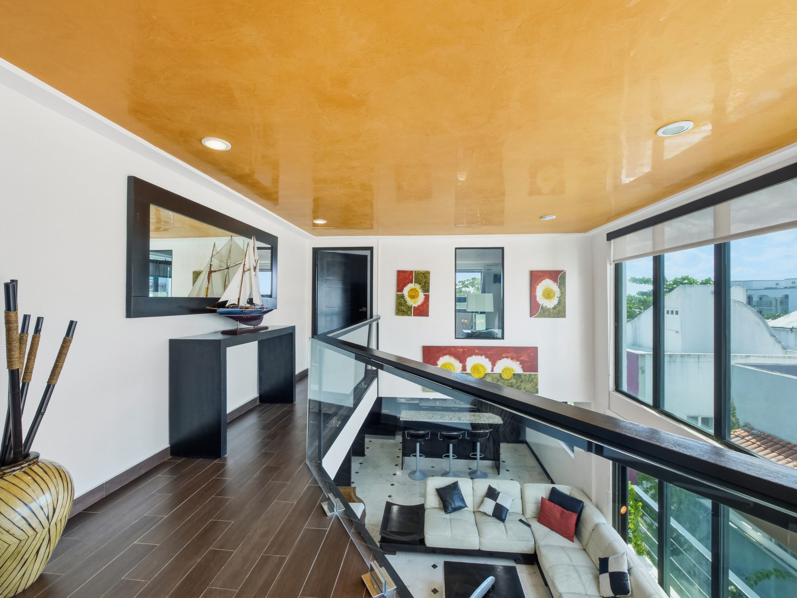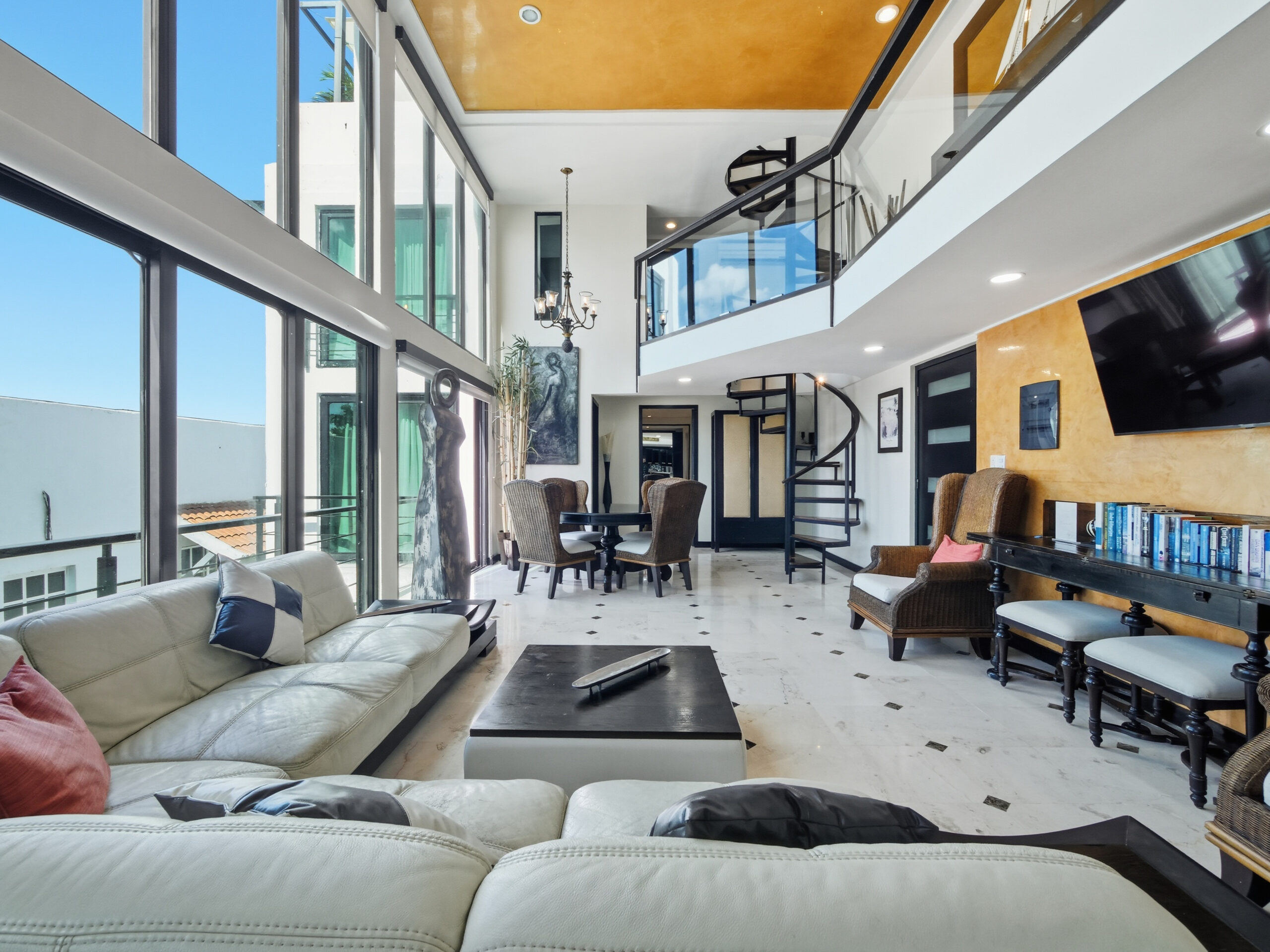 This two-tier penthouse has three bedrooms ideal for groups or families: a main one with a king bed, a secondary with a king bed and another with two single beds. The bathrooms are located in the hallways. Spacious and functional spaces designed to provide privacy, comfort and rest in the heart of Playa del Carmen.