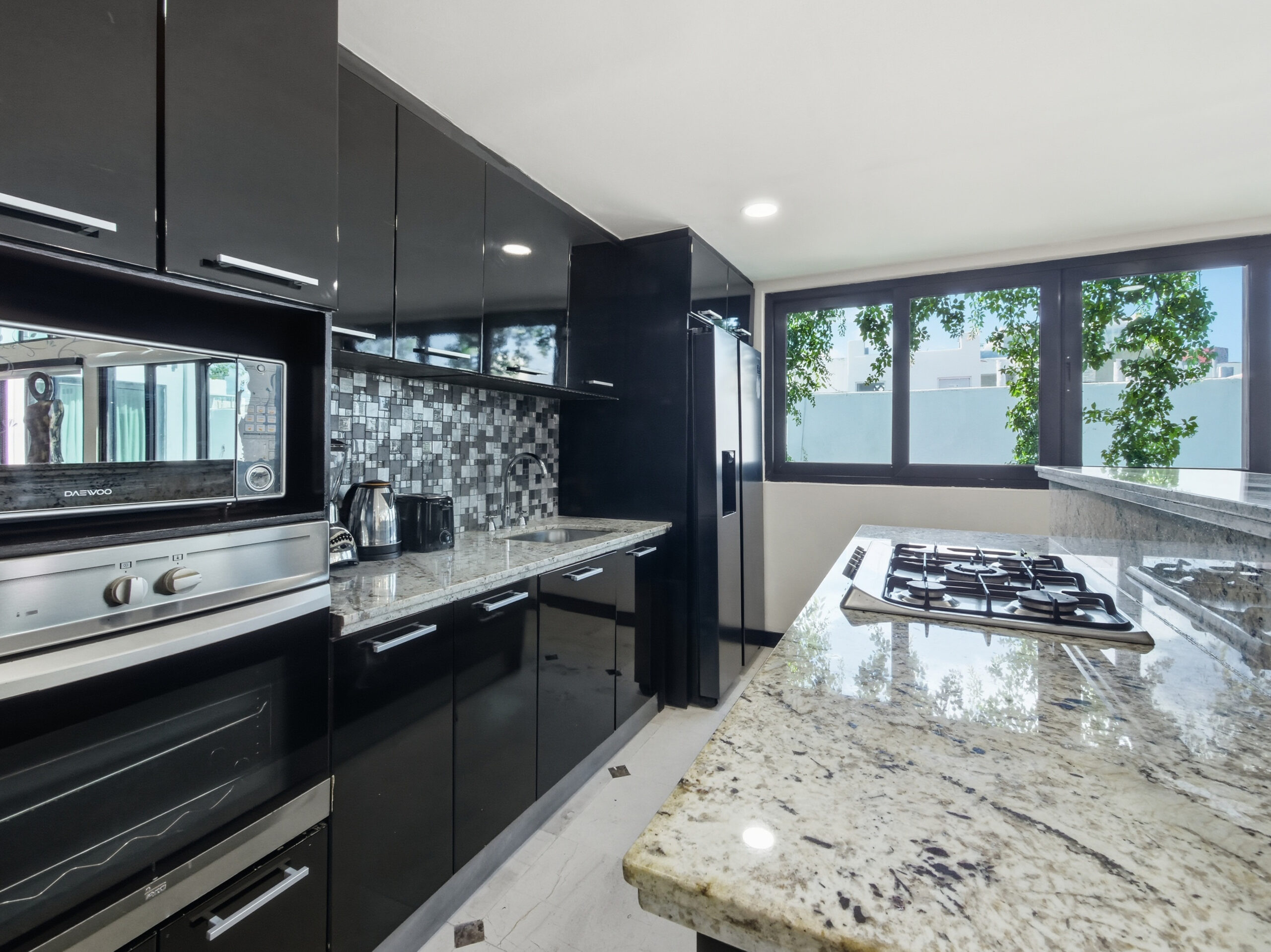 Kitchen equipped with stove, refrigerator and appliances