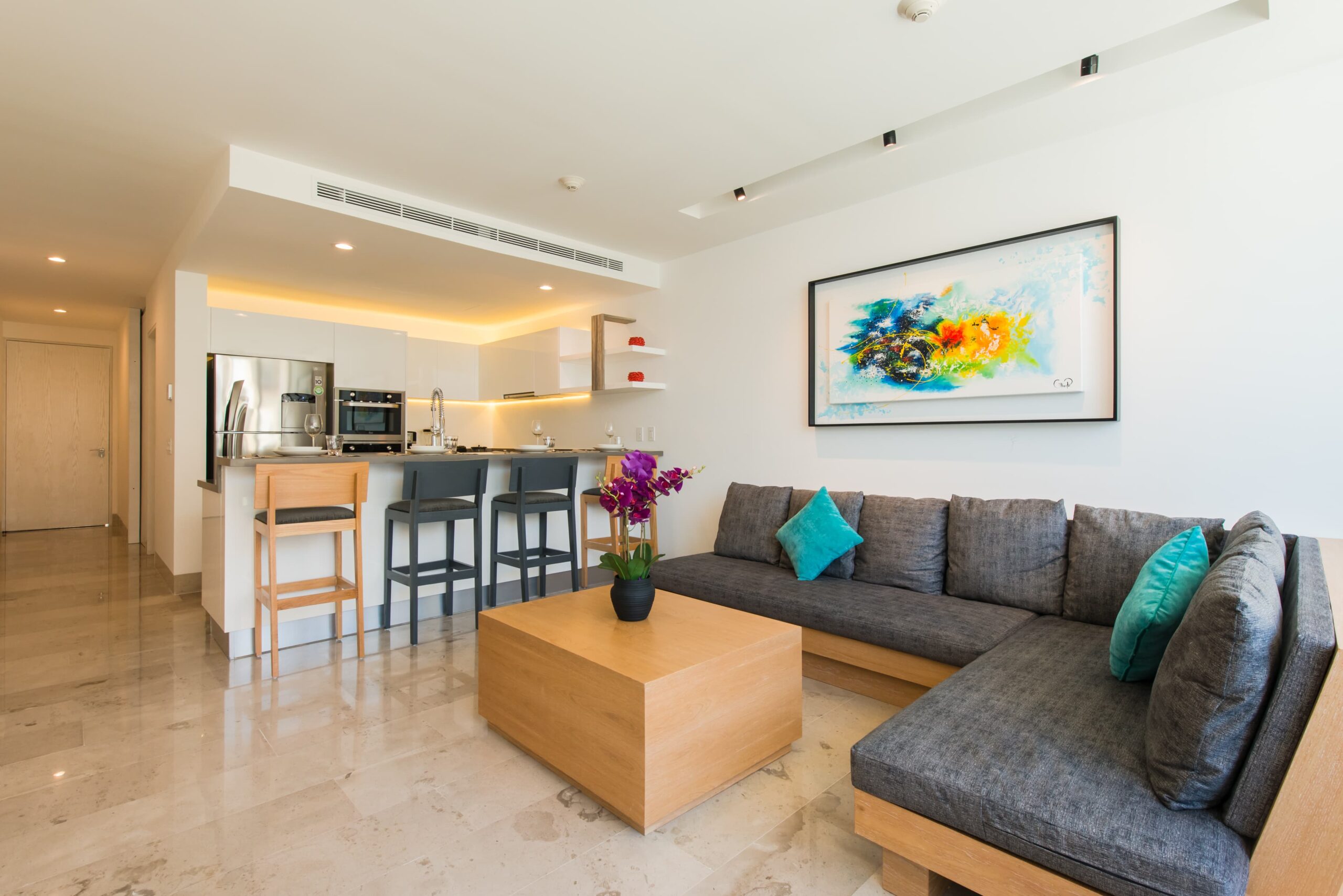 Located in Oceana, this apartment is steps from the sea and 5th Avenue. Enjoy living room with comfortable sofa, smart TV, dining room for six and kitchen equipped with oven, stove, microwave, refrigerator, blender and more. The balcony with exterior furniture is perfect for relaxing. In addition, it has air conditioning, WiFi, laundry center and optional cleaning.